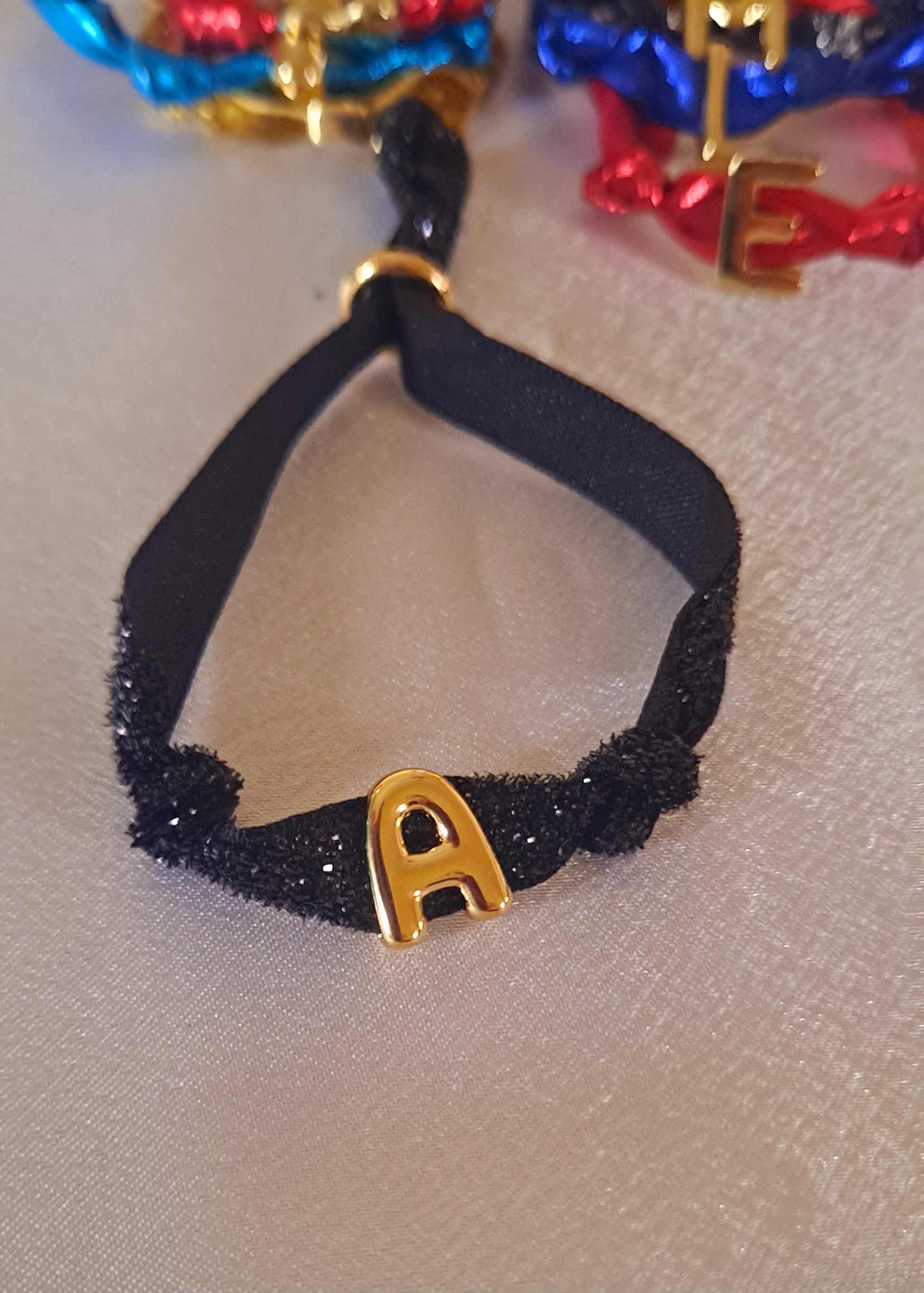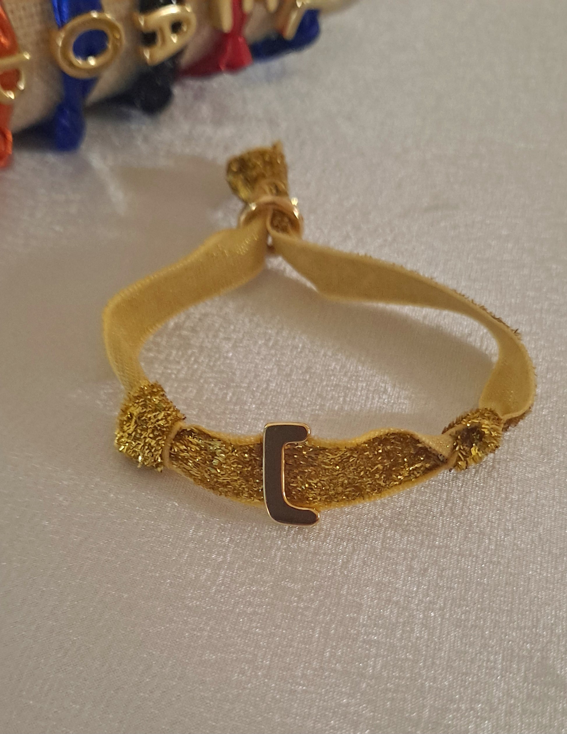 Crea tu look ideal con pulseras con inicial en Baño de oro se ajustan . Tela en colores. Un look perfecto para llevar con otras pulseras.