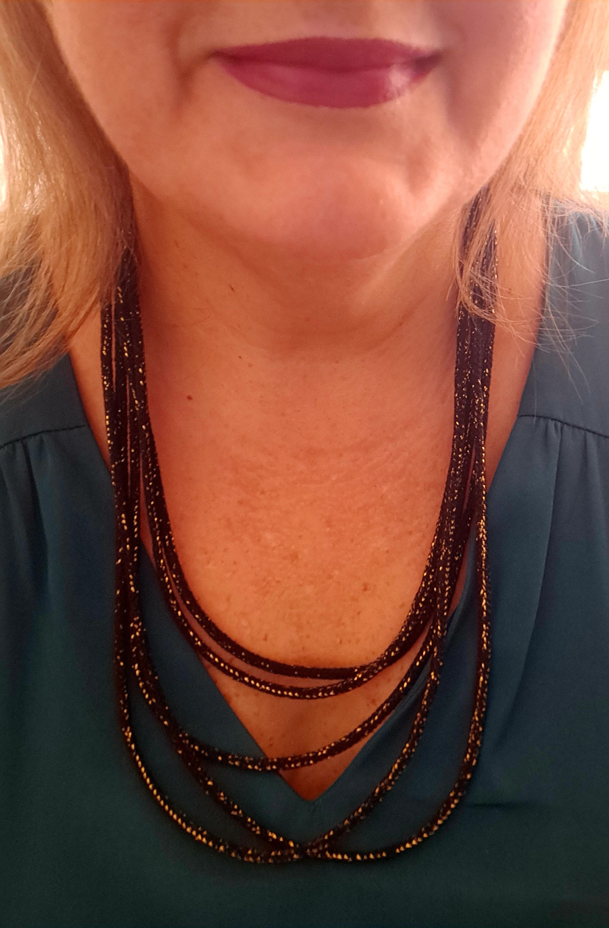 Collar negro estilo "layering" para usar con blusas o trajes creando el efecto de llevar varios collares pero en 1 solo. Su medida mas corta 23" mas larga 28".